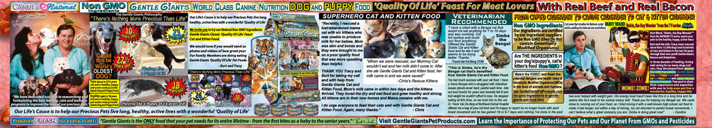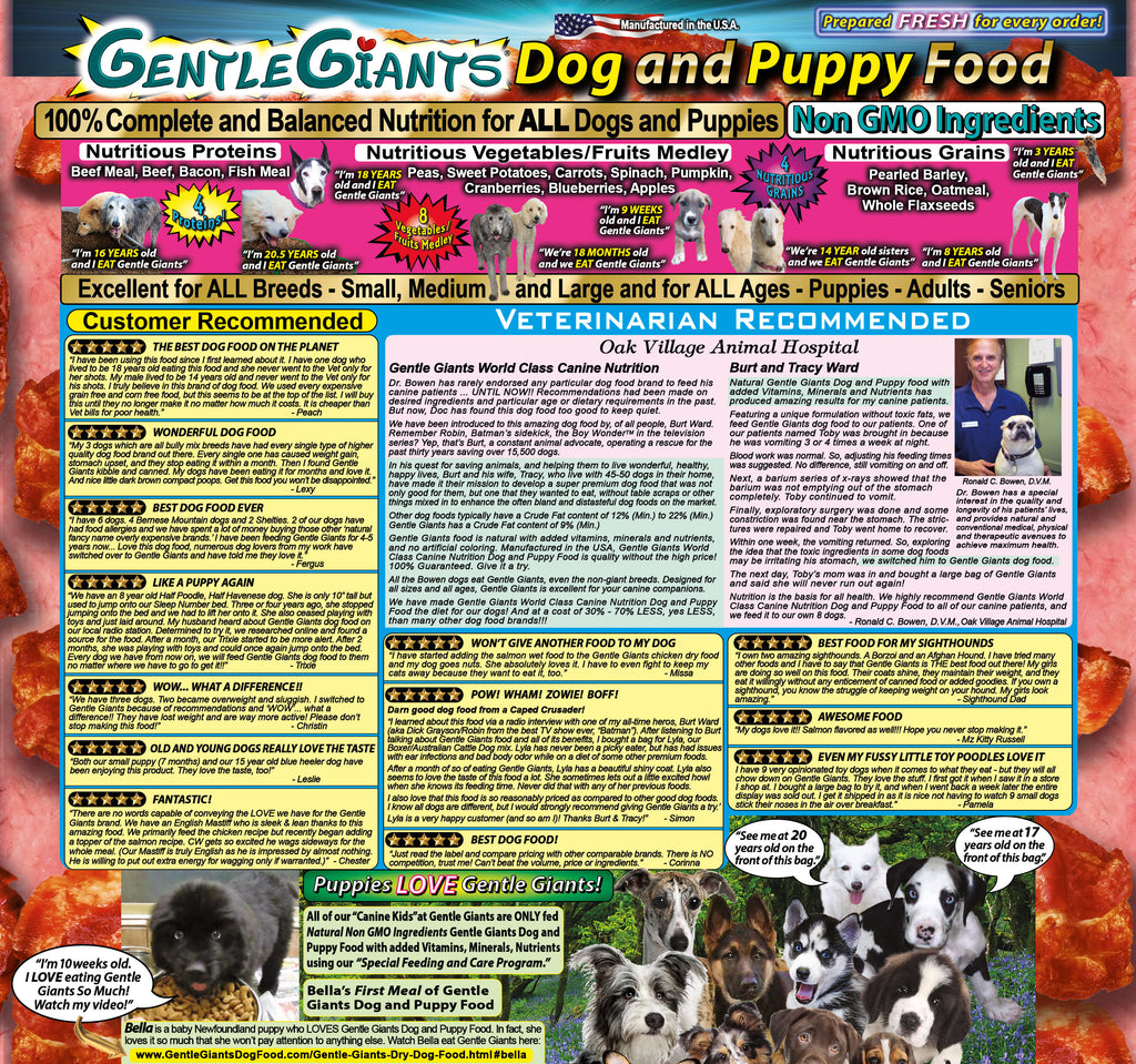 Gentle Giants is made in the USA, is made Fresh for every Order, and is sold Fresh every week. Gentle Giants is the ONLY food that your dog needs for its entire lifetime - from the first bites as a puppy to the senior years. Gentle Giants Dog and Puppy Food is world class nutrition for every breed of dog, for every age and for every stage of life: Puppies - Adults - Seniors - Small - Medium - Large!