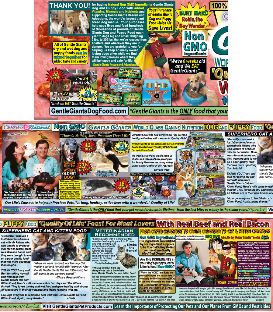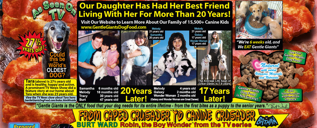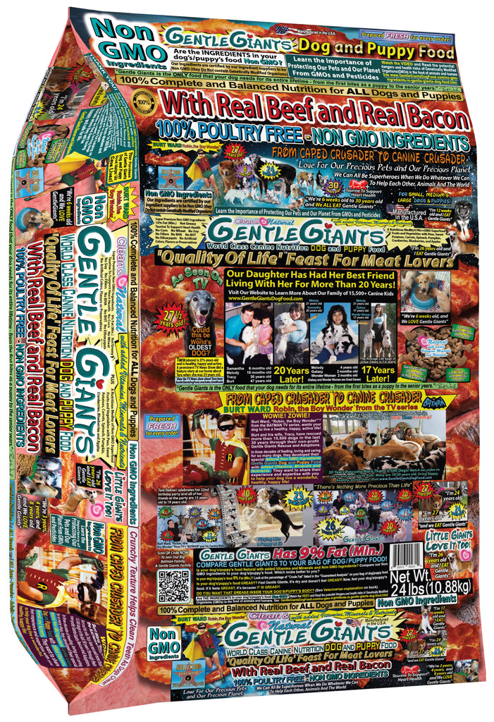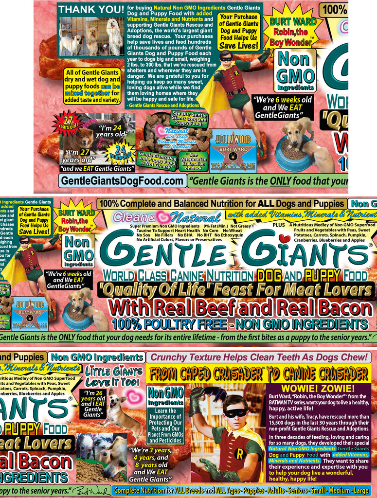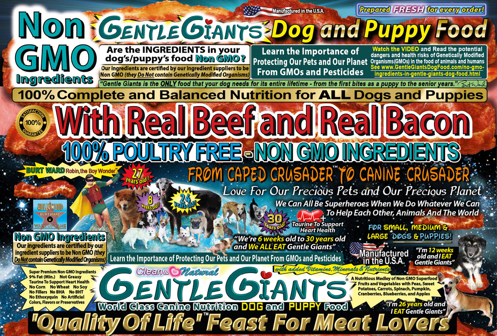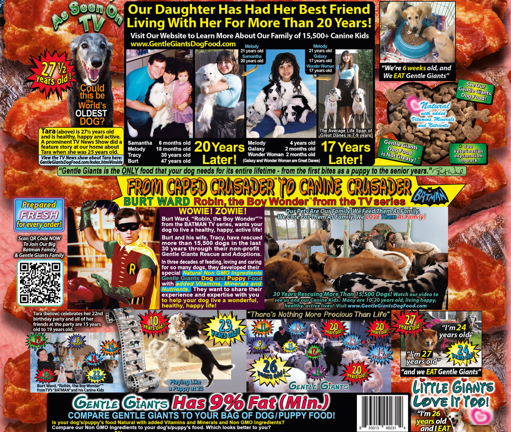 “In their quest for saving animals and helping them to live long, healthy, happy lives, Burt Ward and his wife, Tracy, who live with 45-50 dogs in their home, have developed a super premium dog food that is not only good for them, but one that they want to eat, without greasy taste enhancers, table scraps or other things mixed in to enhance the often bland and distasteful dog foods on the market. All this manipulation to your dog’s food takes a toll on your dog’s system.