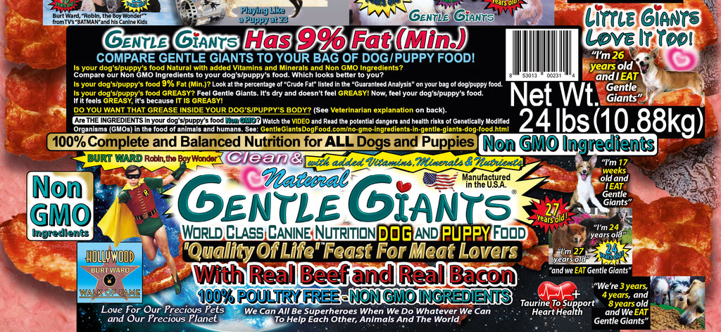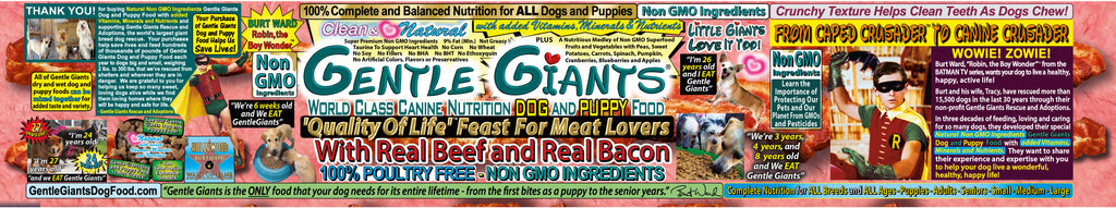 Gentle Giants World Class Canine Nutrition ‘Quality of Life’TM Feast For Meat Lovers with real farm raised beef and real farm raised bacon dog and puppy food is a wholesome blend of All Non-GMO Super Premium Ingredients, including beef, bacon, pearled barley, brown rice, oatmeal and 8 nutritious fruits and vegetables, comprising of pumpkin, cranberries, blueberries, apples, peas, sweet potatoes, carrots, and spinach.