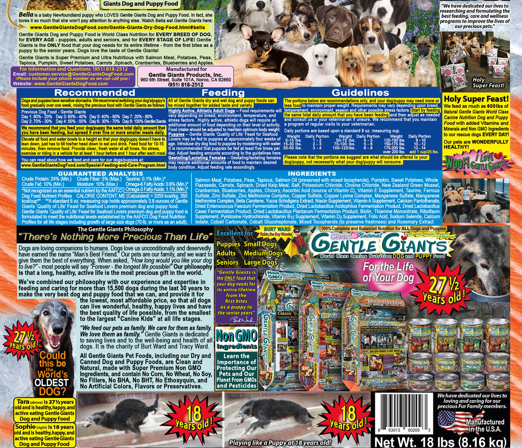 Gentle Giants World Class Canine Nutrition Dog Food is formulated to meet the nutritional levels established by the AAFCO Dog Food Nutrition Profiles for all life stages including growth of large size dogs (70 lb. or more as an adult).