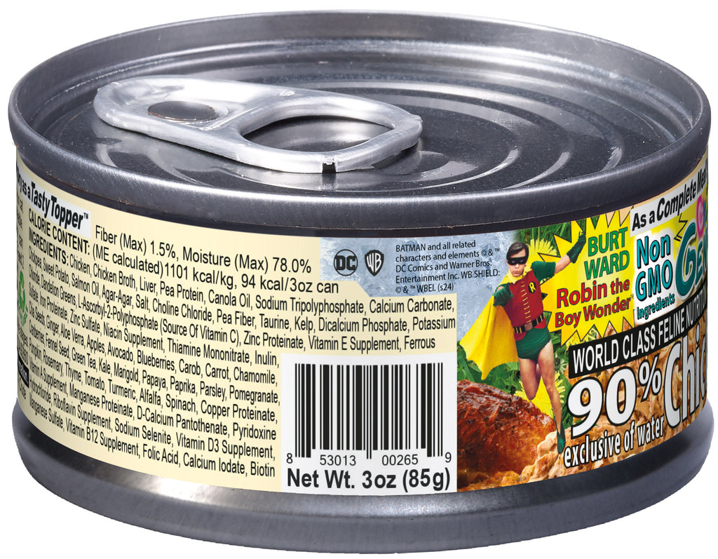 Chicken, Chicken Broth, Liver, Pea Protein, Canola Oil, Sodium Tripolyphosphate, Salmon Oil, Agar Agar, Calcium Carbonate, Chickpea, Sweet Potato, Salt, Dicalcium Phosphate, Choline Chloride, Pea Fiber, Taurine, Potassium Chloride, Kelp, L-Ascorbyl-2-Polyphosphate (source of Vitamin C), Zinc Proteinate, Vitamin E Supplement, Ferrous Sulfate, Iron Proteinate, Zinc Sulfate, Niacin Supplement, Thiamine Mononitrate, Inulin, Chia Seeds, Ginger, Aloe Verra, Apples, Avocado, Blueberry, Carob, Carrot, Chamomille, Cranberries, Fennel Seed, Green Tea, Kale, Marigold, Papaye, Paprika, Parsley, Pomegranate, Pumpkin, Rosemary, Spirulina, Thyme, Tomato, Turmeric, Alfalfa, Spinach, Copper Proteinate, Vitamin A Supplement, Sodium Selenite, Manganese Sulfate, Vitamin D3 Supplement, Vitamin B12 Supplement, Calcium Iodate, Biotin, Folic Acid.