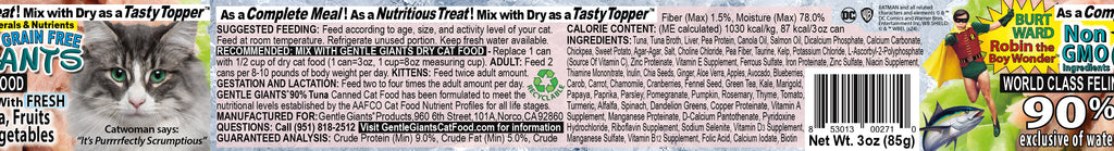 CALORIE CONTENT (Calculated) = 1086 kcal/kg, 92 kcal/85g can ME