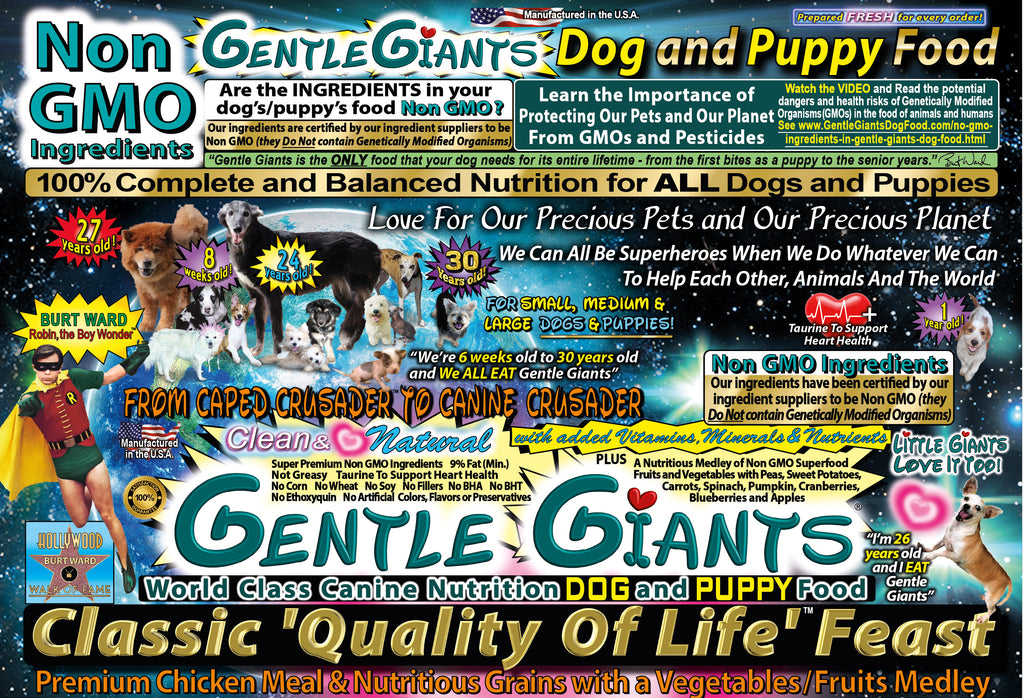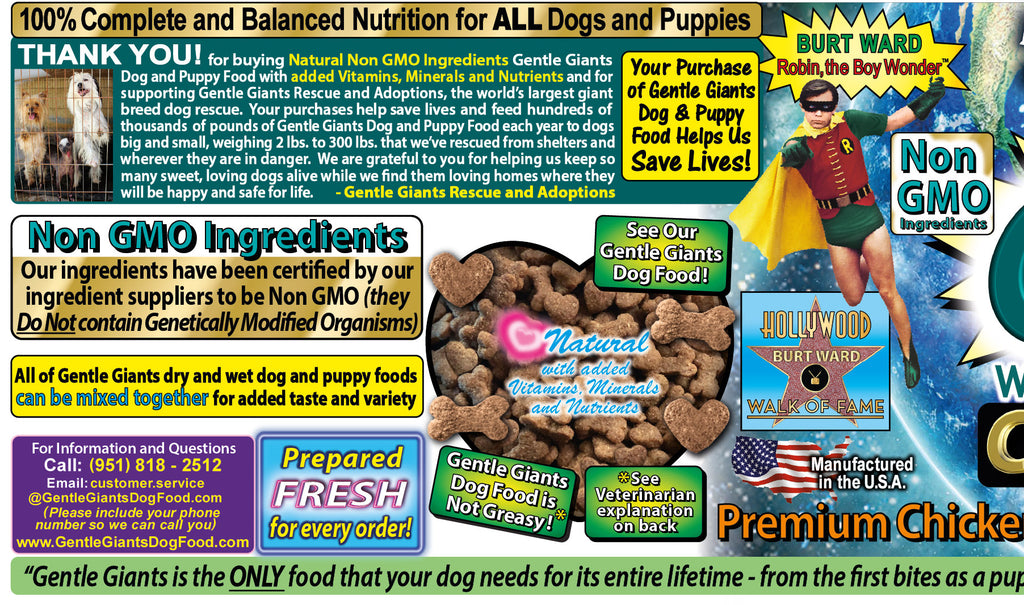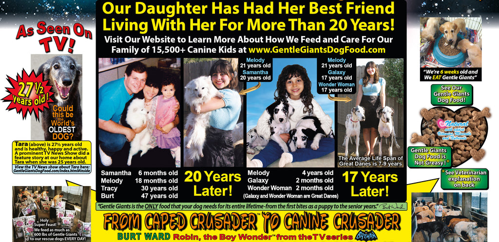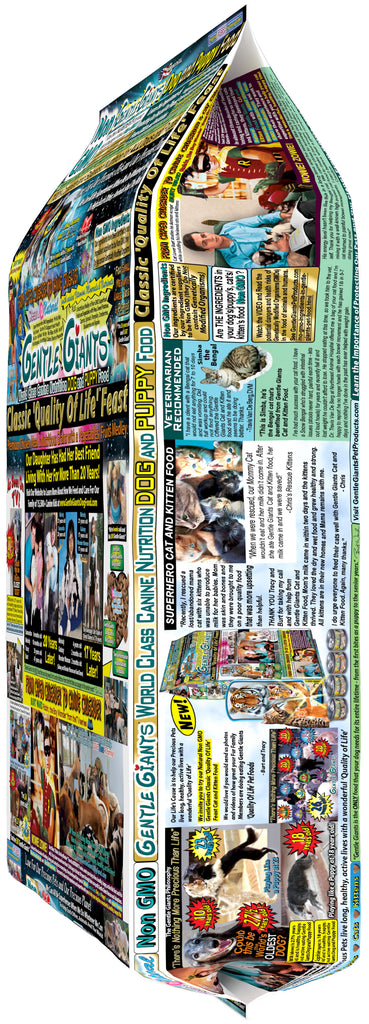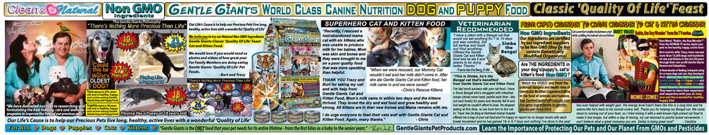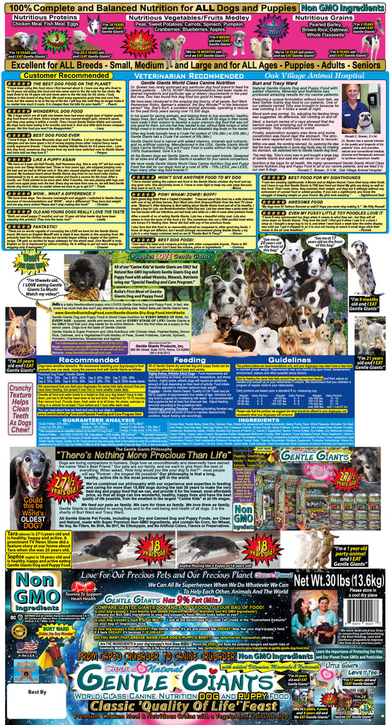 Our life's cause is to help all dogs live the longest, healthiest, happiest lives possible. Gentle Giants Dog and Puppy Food is excellent for all dogs and puppies of all ages, sizes, and stages of life - from 2 pounds to 300 pounds - from the youngest 3 1/2 week old puppies to the oldest seniors that are 27 years old. Read about all of our products and ingredients, and how we intentionally made Gentle Giants Dog and Puppy Food affordable, so that all dogs can benefit.