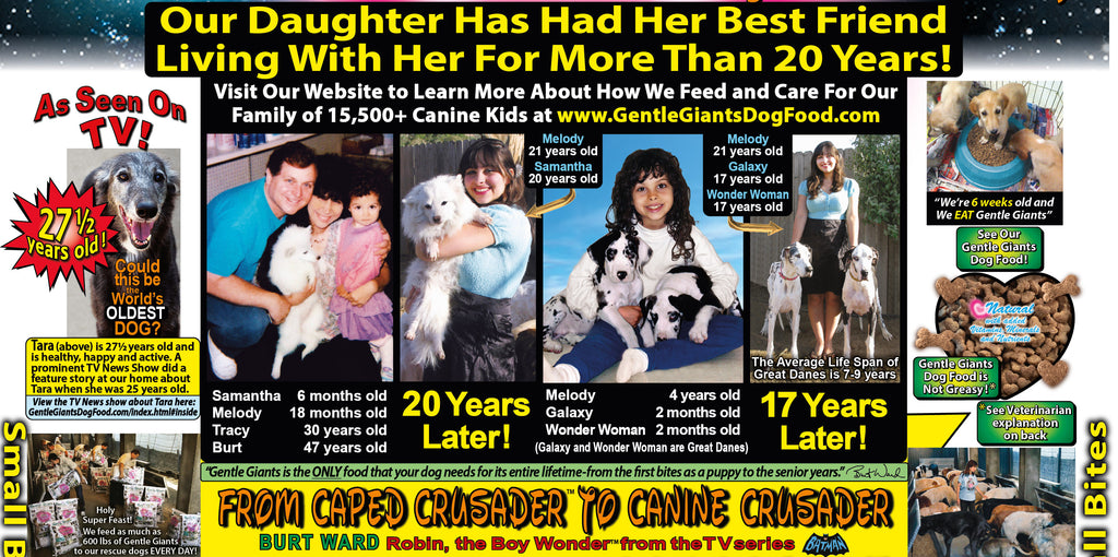 Our life's cause is to help all dogs live the longest, healthiest, happiest lives possible. Gentle Giants Dog and Puppy Food is excellent for all dogs and puppies of all ages, sizes, and stages of life - from 2 pounds to 300 pounds - from the youngest 3 1/2 week old puppies to the oldest seniors that are 27 years old. Read about all of our products and ingredients, and how we intentionally made Gentle Giants Dog and Puppy Food affordable, so that all dogs can benefit.